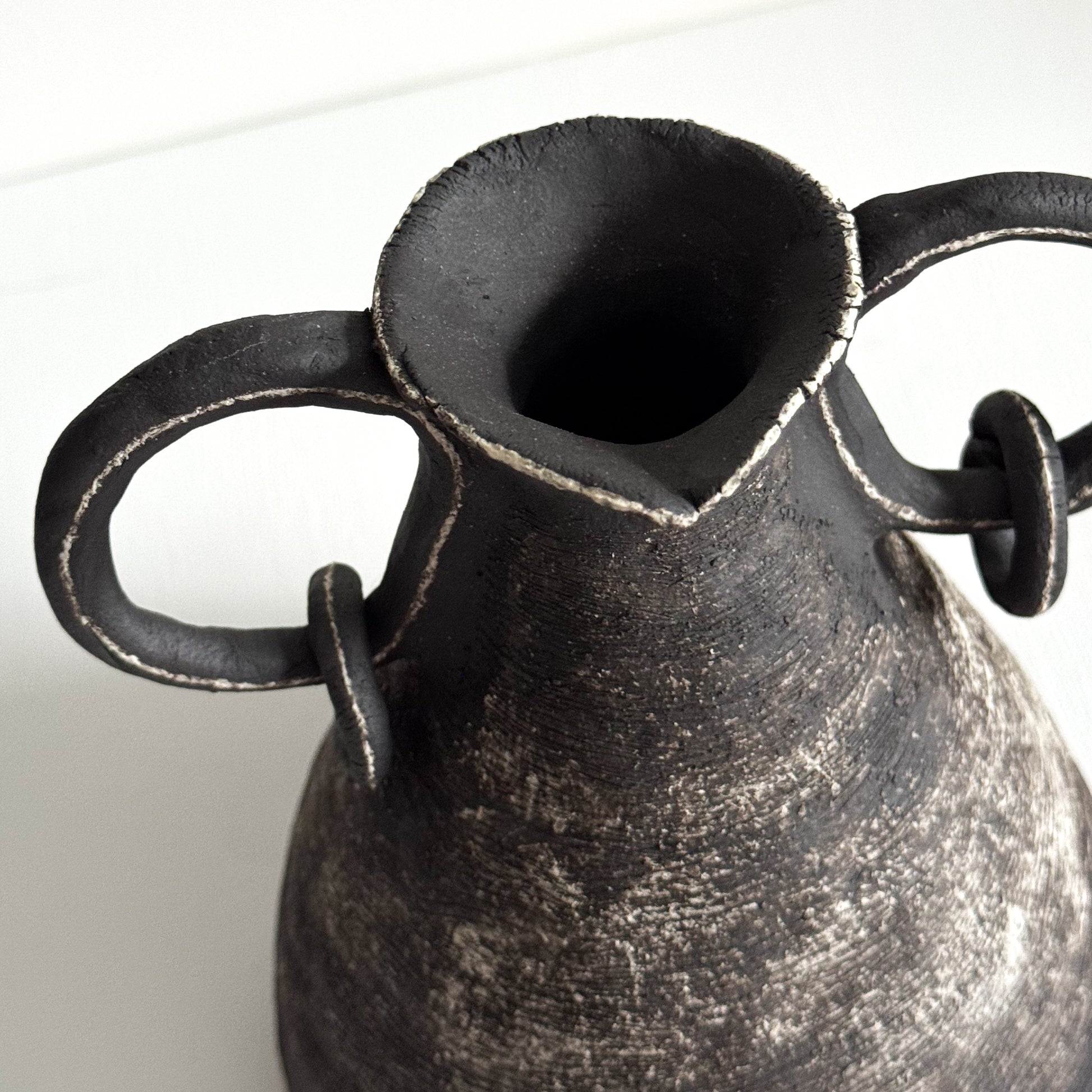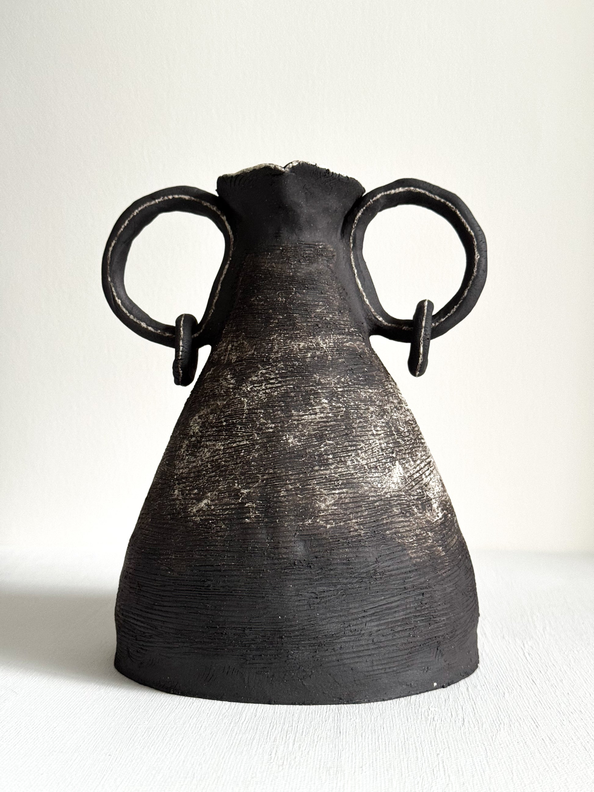 This hand-built vessel is shaped from dark stoneware and finished with gestural sweeps of white slip that catch and emphasize its textured surface. Rising to a narrow neck with softly crimped edges, the form is balanced by two wide, looped handles that meet the body with small ringed joins—offering both strength and expressive movement.