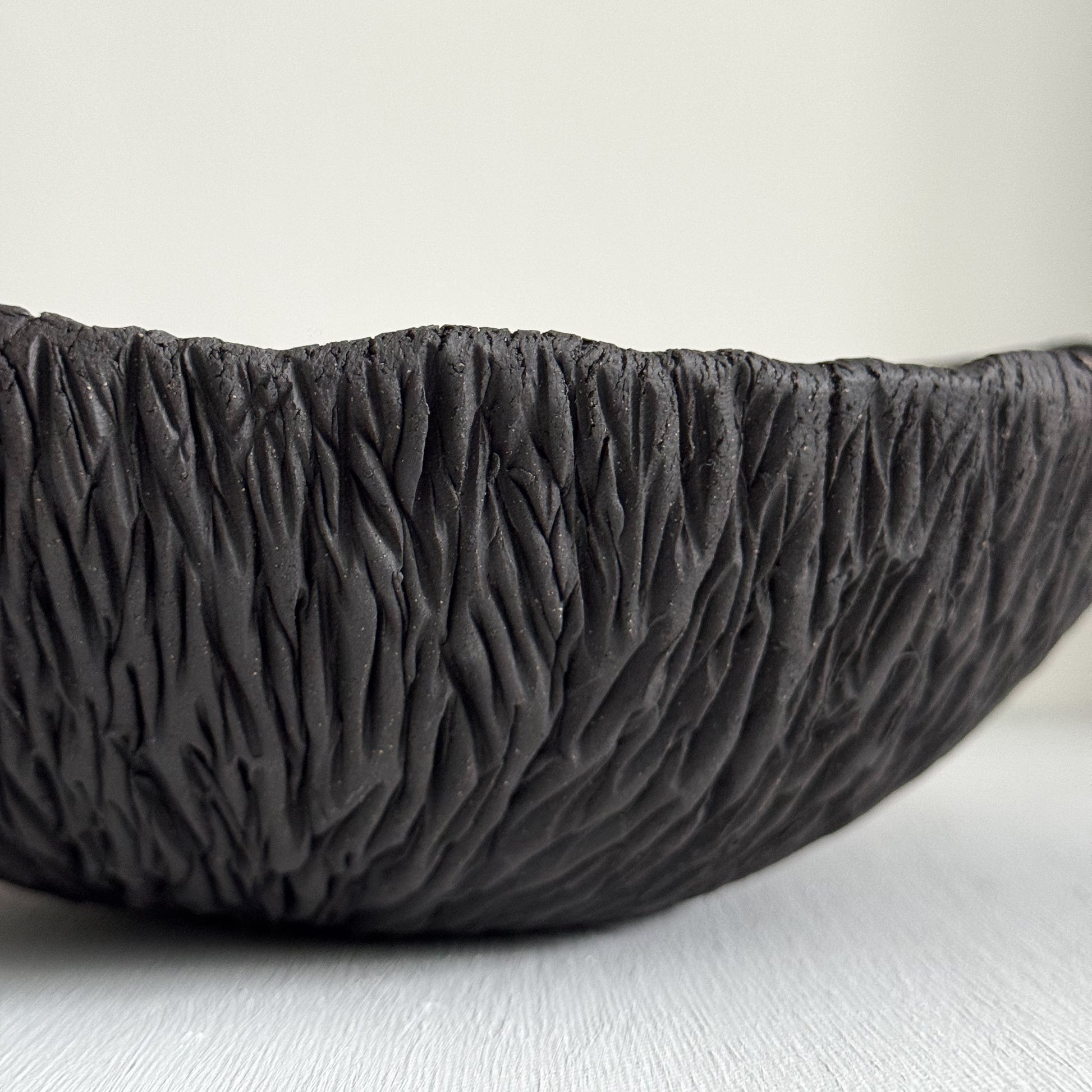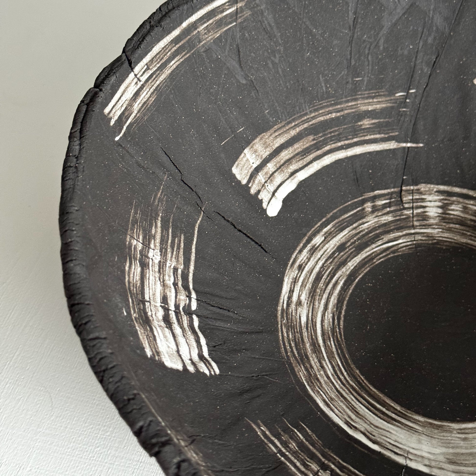 Crafted slowly by hand from dark stoneware clay, this sculptural bowl embraces imperfection as part of its quiet beauty. The bark-like exterior texture is carved intuitively, while the interior reveals expressive white slip brushwork and subtle cracks—intentionally left visible to honor the natural tension and transformation of the clay.
